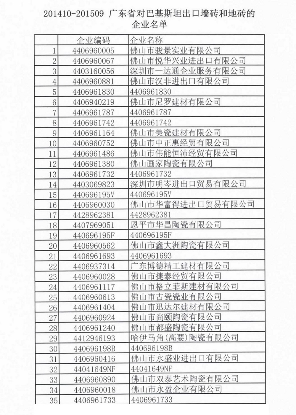 2月19日,應(yīng)Shabbir Tiles & Ceramics Limited的申請(qǐng),巴基斯坦對(duì)原產(chǎn)于中國(guó)的墻磚和地磚進(jìn)行反傾銷立案調(diào)查。涉案產(chǎn)品海關(guān)編碼為6907.1000、6907.9000、6908.1000、6908.9010、6908.9090。本案的傾銷調(diào)查期為2014年10月1日~2015年9月30日,損害調(diào)查期為2012年10月1日~2015年9月30日。據(jù)統(tǒng)計(jì),我省涉案產(chǎn)品在調(diào)查期內(nèi)對(duì)巴基斯坦出口額約5727萬(wàn)美元,出口額10萬(wàn)美元以上企業(yè)共71家(詳見(jiàn)附表)。